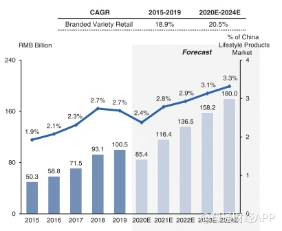 在此推动下, 国内品牌品种零售市场的市场规模从2015年的503亿元增加到2019年的1005亿元,并预计从2020年到2024年,CAGR进一步增加20.5%,并最终形成一个达到1800亿元的庞大市场。