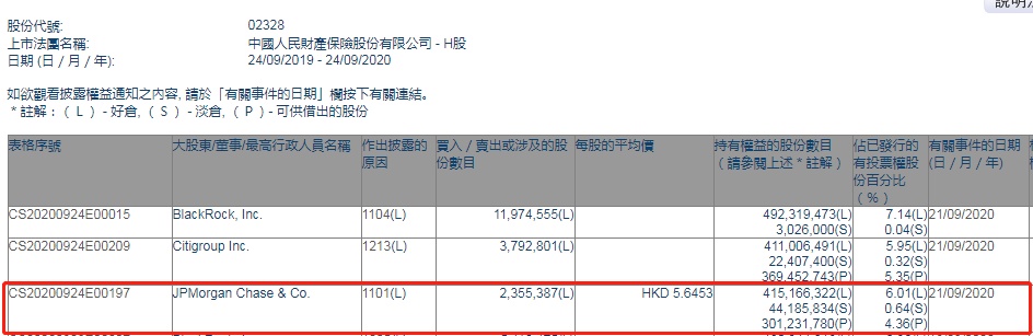 智通财经APP获悉,香港联交所最新资料显示,9月21日,摩根大通增持中国财险(02328)235.5387万股,每股作价5.6453港元,总金额约为1329.69万港元。增持后最新持股数目约为4.15亿股,最新持股比例为6.01%。