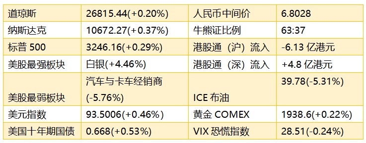 1、隔夜美股截至收盘,道琼斯指数涨52.31点,涨幅0.20%,报26815.44点;标普500指数涨9.24点,涨幅0.29%,报3246.16点;纳斯达克综合指数涨39.28点,涨幅0.37%,报10672.27点。港股ADR指数按比例计算,收报23342点,涨30.68点或0.13%。