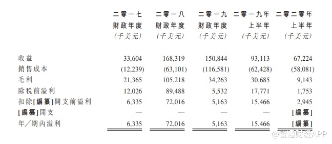据招股书披露,2017-2019财政年度,该公司营收分别为3360万美元、1.68亿美元和1.51亿美元。期内利润分别为634万美元、7202万美元和516.3万美元。公司毛利率分别为63.6%、62.5%和22.7%。