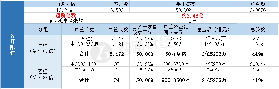 其中,公开配售申购人数10349,一手中签率50%,超购倍数约3.43倍。