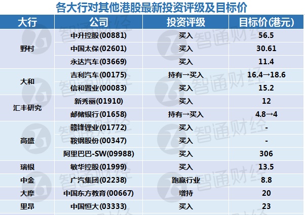 二、各大行对其他港股最新投资评级及目标价