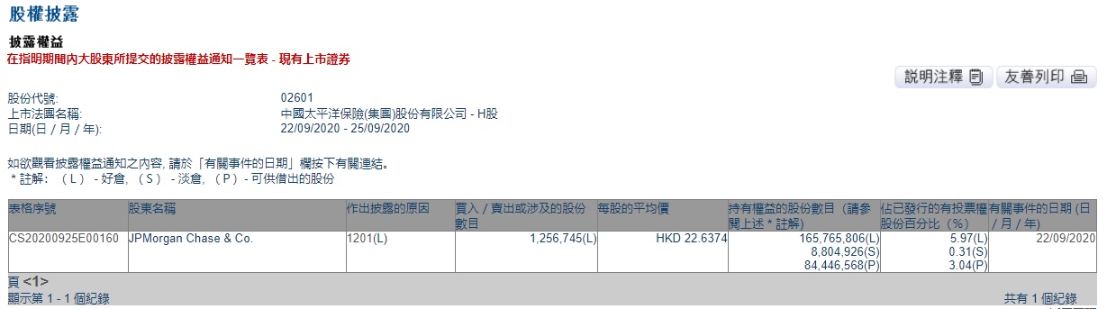 智通财经APP获悉,香港联交所最新资料显示,9月22日,摩根大通减持中国太保(02601)约125.67万股,每股作价22.6374港元,总金额约为2844.84万港元。智通财经APP获悉,减持后最新持股数目为1.66亿股,最新持股比例为5.97%。