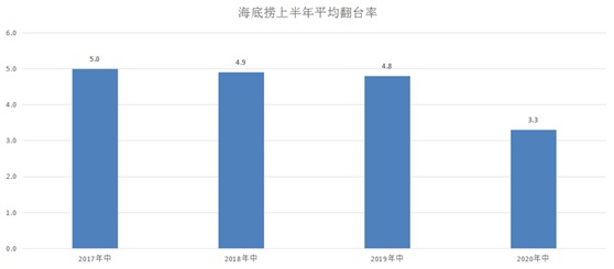今年上半年,海底捞门店的整体翻台率仅为3.3,反观过去三年,这项数据在4.9左右,数据降幅明显。