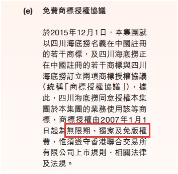早在2007年,颐海国际就与海底捞集团达成协议,颐海国际将能够以独家、免费的方式,无限期地使用“海底捞”商标。