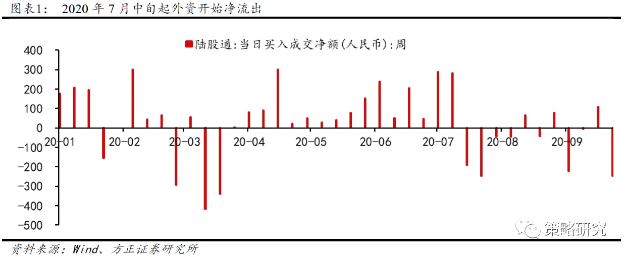 今年7月中旬起外资开始净流出,9月以来外资流出速度加快。3月底以来,外资大幅流入A股市场,从3月23日起连续16周净流入,净流入规模超过1966亿元。7月中旬起外资流向发生明显转变,从7月中旬到8月上旬外资连续4周净流出,流出规模超过525亿元。其中7月14日单日净流出约174亿元,为今年以来单日净流出规模最大的交易日。9月以来外资流出速度明显加快,本周的五个交易日外资均呈现净流出状态,合计净流出247亿元,为历史第六大单周净流出。从单月的流出规模来看,截止到9月25日,9月合计净流出287亿元,为历史上第四大单月净流出;如果将时间缩小到2016年12月自深港通开通以来,9月单月净流出规模位于历史第三位,仅次于2020年3月和2019年5月。