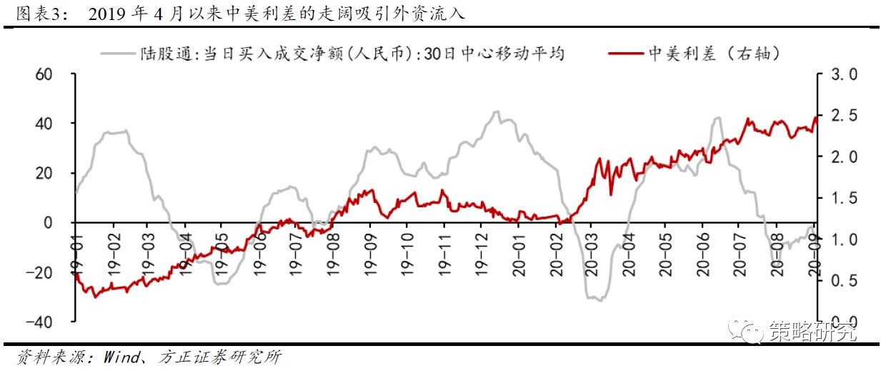 2、外资流入流出的趋势性决定因素经历了由汇率、中美利差、卫生事件所处阶段的转变。2018年中美贸易摩擦开始至2019年4月期间,外资流向同人民币汇率密切相关,即贬值时期外资边际流出,升值时期外资边际流入。2019年5月开始,由于关税战开始弱化,贸易摩擦对于中国经济预期的影响趋弱,中国经济下行最快的阶段过去,同期美国经济持续下行,中美利差开始走扩,叠加A股被纳入三大国际指数,外资持续流入。今年卫生事件爆发之后,由于国内外卫生事件不同步,外资在国内卫生事件阶段大幅流出,随着国内卫生事件迅速得到控制,经济率先复苏,叠加海外资金成本大幅降低,外资在3月份之后大幅流入。