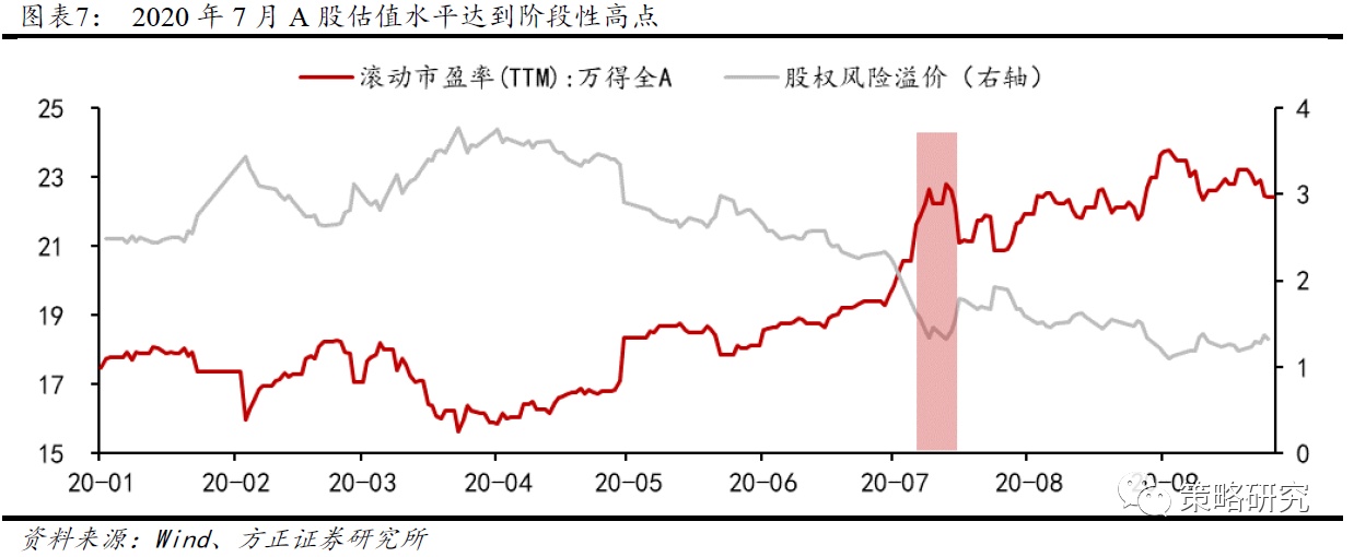 7月以来外资大幅流出的主要原因是A股估值达到阶段性新高,股权风险溢价不断下降。A股从3月23日底部反弹以来,估值水平也在不断抬升,万得全A市盈率从3月底的15.6一路上行,到7月10日市盈率达到22.6,估值扩张幅度超过44.9%。外资持仓前三名的食品饮料、医药生物、家用电器等行业估值水平在7月中旬也接近历史最高位。与此同时,A股的风险溢价从4月起不断下行,表明A股的价值优势也在不断下降。随着7月以来市场流动性边际收紧的迹象开始显现,外资对高估值股票的风险偏好开始降低,造成了外资从A股高估值板块的大幅流出。