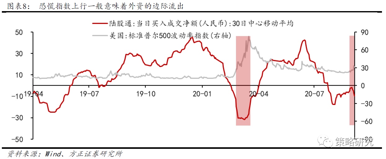 2020年2-3月和9月以来外资流出的主要原因是短期内全球风险偏好的大幅波动。全球风险偏好一旦因为事件性因素出现大幅扰动,外资一般选择离场观望。2月下旬开始,卫生事件开始在全球范围内蔓延,短期内造成了市场的恐慌。美股在3月的四次熔断创下了历史记录,VIX指数也从2月下旬的13.7迅速跳高至3月中旬的82.7,全球风险偏好出现大幅波动。在此背景下外资从A股加速流出,3月外资净流出金额超过678亿,单月净流出规模居历史第一位。9月以来外资流出速度加快的主要逻辑依旧是全球风险偏好的大幅波动扰动。美股自3月23日以来实现V型反弹,纳指在6月初收复全部失地后继续屡创新高,但美国科技股与经济基本面走势的背离使市场对股市泡沫化的担忧不断加剧。随着9月以来美国科技股的多次大幅回调和欧洲卫生事件的二次爆发加剧了市场恐慌,VIX指数开始从底部阶段性跳升,全球风险偏好再次出现大幅波动,加快了外资的流出速度与规模。