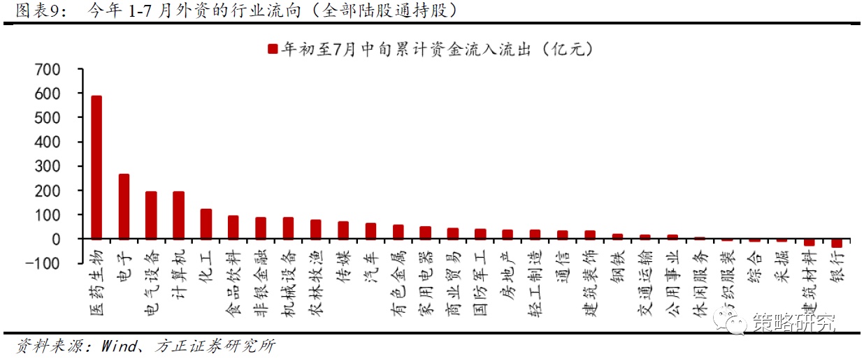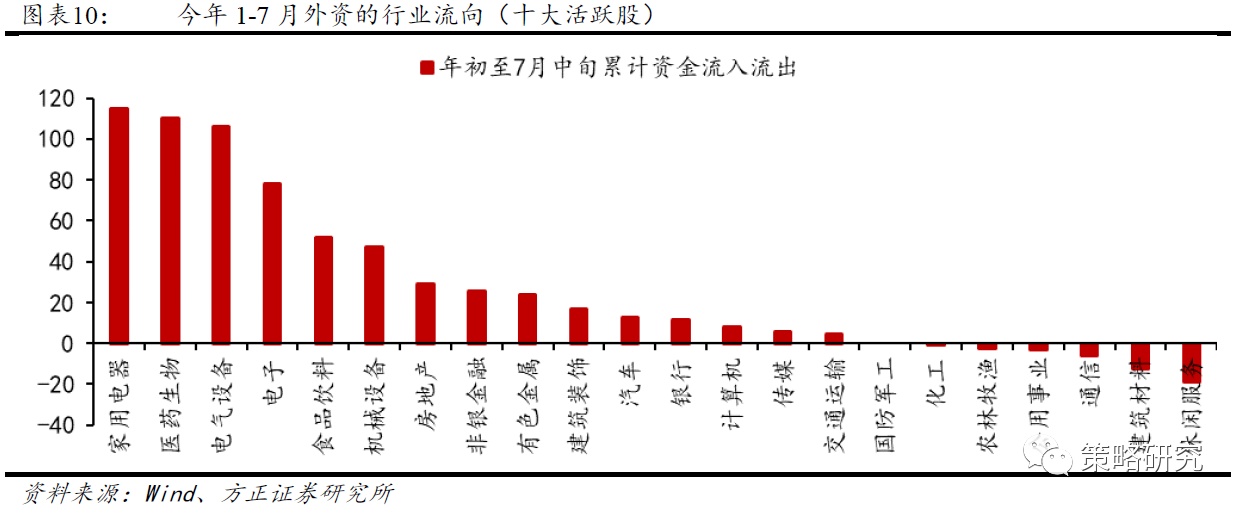 年初至7月中旬外资主要流入医药生物、电子、电气设备和计算机等行业,部分顺周期行业小幅流出。从全部陆港通持股来看,外资流入最多的行业为医药生物,流入规模达到587.1亿元,此外,电子、电气设备和计算机行业也有较多外资流入,分别为263.9亿、193.2亿和192.4亿。外资流出前三的行业分别是银行、建材、采掘,分别流出31.4亿、22.8亿、8.3亿。从陆股通十大成交活跃股来看,成交额占全部陆股通的33.2%,具有较强的代表性,外资流入量最多的十大活跃股集中在家电、医药和电气设备行业,流入规模分别为114.6亿、110.3亿和106.0亿。外资流出量最多的十大活跃股集中在休闲服务、建材、通信行业,流出规模分别为19.1亿、12.4亿、5.7亿。总体来看,在全球卫生事件爆发的背景下,外资大幅流入的行业集中在医药生物以及逆周期行业,部分顺周期行业存在小幅流出现象。