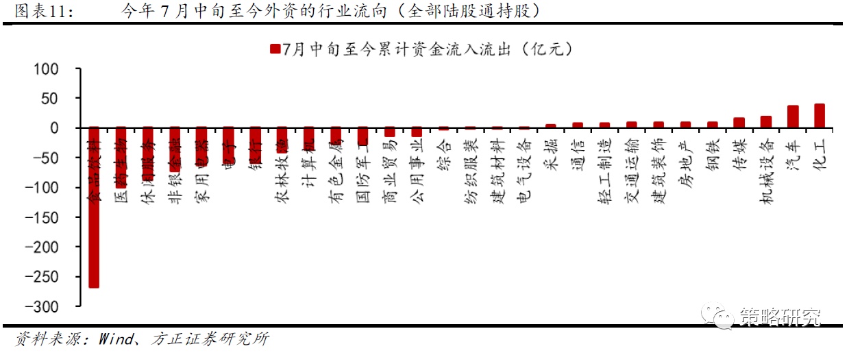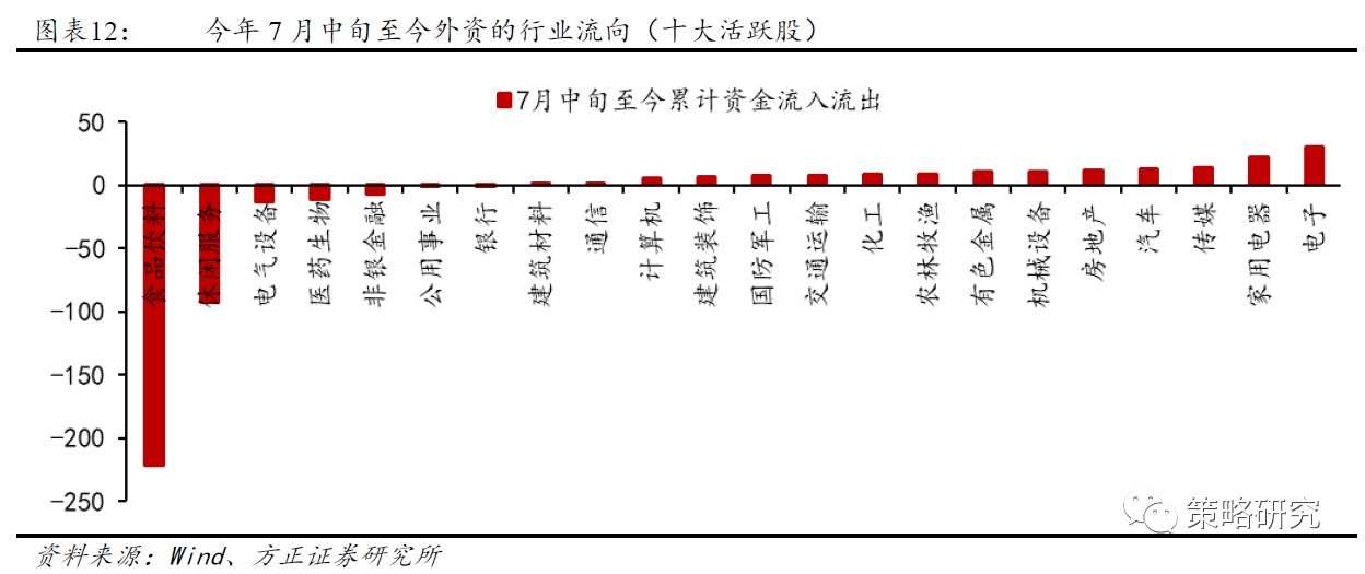 7月中旬至今,外资大幅流出的行业主要集中在食品饮料、医药生物等消费板块,部分顺周期行业小幅流入。从全部陆港通持股来看,外资流出最多的行业为食品饮料,流出规模达到267.1亿,此外,医药生物、休闲服务、非银金融也有较多外资流出,分别为99.5亿、87.6亿和72.1亿。同期,外资在部分顺周期行业上存在小幅净流入,如化工、汽车和机械设备行业分别流入38.4亿、36.3亿和17.9亿。从陆股通十大成交活跃股来看,外资流出的活跃股集中在食品饮料和休闲服务,流出规模分别达到221.1亿和92.2亿。外资流入的活跃股集中在电子、家电、传媒、汽车等行业,流入规模分别为30.0亿、21.7亿、14.1亿、12.5亿。总体来看,7月以来外资大幅流出的行业集中在消费板块,部分顺周期板块的行业存在流入现象。