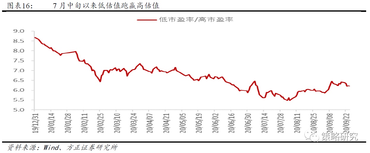 外资的配置思路具有一定借鉴意义,边际上增配低估值顺周期相关的领域。7月中旬以来外资大幅流出超过800亿,流出的行业主要是集中在估值偏高的行业,从流入的行业来看,低估值顺周期相关的化工、汽车、机械设备等行业流入居前。反观年初至7月中旬这一外资大幅流入的时间段,外资大幅流入超过1800亿,流入的行业主要是医药生物、电子、电气设备这些受益于卫生事件或成长属性较为明显的行业。一定程度上体现了外资配置思路的转变,即减配高估值、与流动性扩张密切相关以及卫生事件受益的行业,增配低估值、与经济复苏预期相关的行业。体现在市场走势上,7月中旬以来低市盈率指数明显跑赢高市盈率指数,风格上周期跑赢成长。