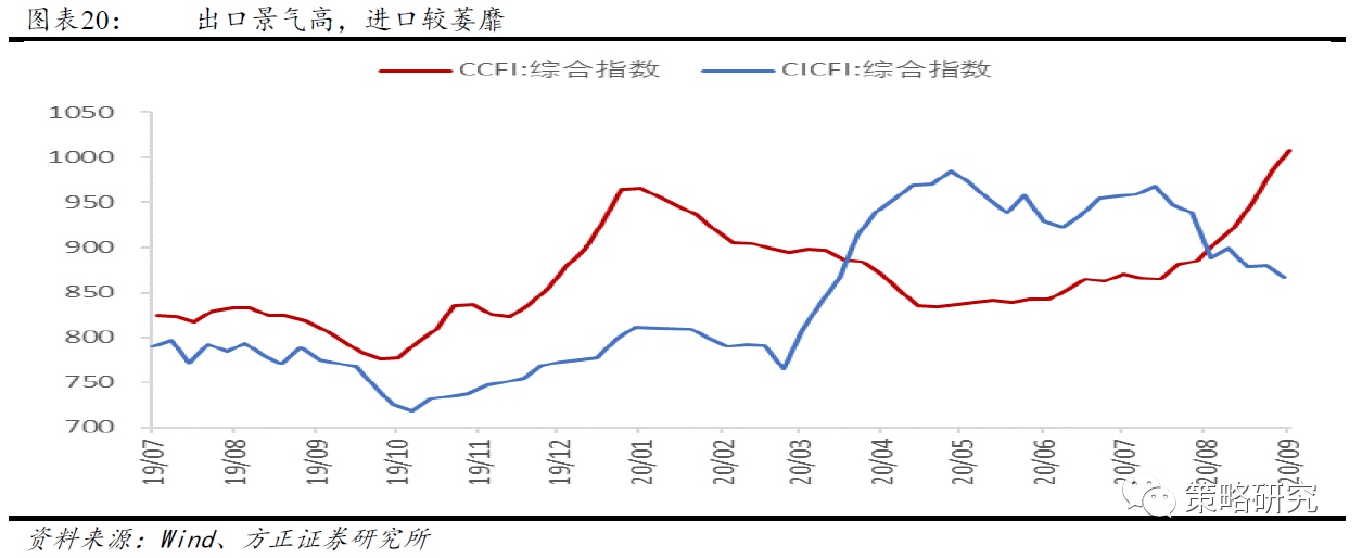 从决定低估值顺周期逻辑的核心因素来看,国内经济复苏态势依然良好。决定低估值顺周期的核心因素在于经济复苏的趋势,从国内经济的各项指标来看,生产端数据略有回落,高炉开工率、钢厂产能利用率、化工产业链开工率具有小幅度的下滑,但依然维持在较高水平;需求端的数据继续修复,30大中城市地产销售面积同比增速回落至5%左右,但环比仍在上升,去年基数压力较为明显;9月前三周汽车销量同比增长12%,环比增长11%,均好于预期;进出口依然维持出口高景气,进口较萎靡的格局,表明国内生产端韧性继续维持,外需不振的局面难有改观。