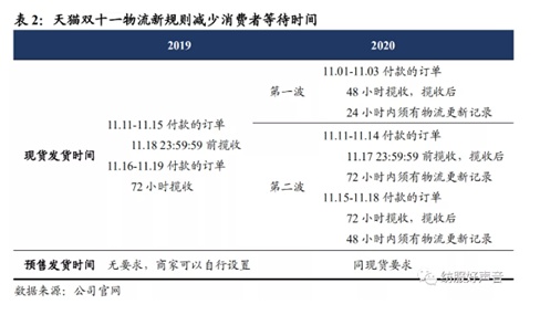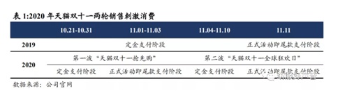 活动时长方面,天猫延长销售时间,并制造两次活动高潮促进用户消费。2020年天猫双十一活动分为两波,分别为第一波“天猫双十一抢先购”,第二波“天猫双十一全球狂欢日”,而2019年天猫双十一活动仅一天销售时间,相较下新的规则中第一次尾款支付时间提前了10天,尾款支付时间从1天增加至4天。当前消费环境回暖,天猫此次措施增加品牌曝光度,强化了对消费者购买欲望的刺激,有望促成公共卫生事件后消费新高峰,拉动双十一高增长。
