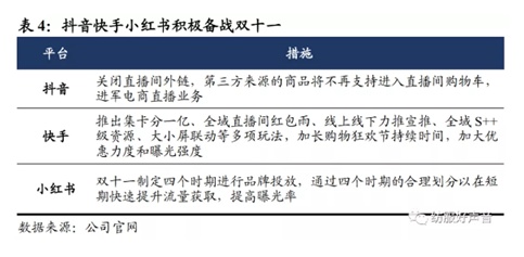 新兴电商平台积极参与,促销方式丰富,线上收入有望取得快速增长。抖音:关闭直播间外链,进军电商直播业务,双十一将与其他电商平台同台竞技,成为淘宝、天猫、京东等平台外又一线上购物选择。快手:推出百亿补贴、红包雨等优惠活动,加大持续时间、优惠力度和曝光强度,预计将创造快手电商收入新高。小红书:双十一制定四个时期进行品牌投放,通过四个时期的合理划分以在短期快速提升流量获取,提高曝光率。