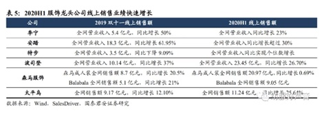 双十一各平台加大支持力度,服饰龙头企业线上收入增长可期。天猫从活动时长、折扣力度、物流支持三方入手,刺激公共卫生事件后消费需求。京东双十一多阶段多玩法,为商家提供流量资金等多方面支持。快手、抖音、小红书等新兴电商平台积极参与,促销方式丰富,有望取得快速增长。服饰龙头企业2020H1线上收入实现高增长,其中李宁2020H1线上收入同比增长23%,安踏2020H1线上收入同比增长超过30%。在各电商平台的大力支持下,服饰龙头企业双十一线上收入预计取得亮眼增长。