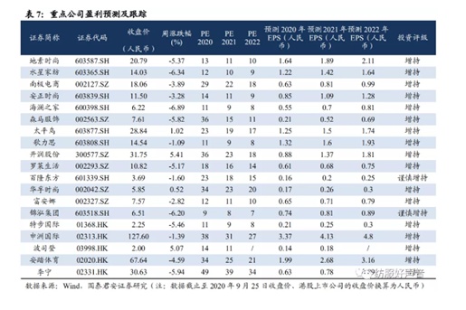 3)港股公司:安踏体育:公司线上收入维持高增长,发展较好,预计线上业务较好增长可以减轻卫生事件带来的冲击。李宁:公司改革成效显现,收入回归快速增长,引领国潮时尚,预计未来业绩增势强劲。波司登:公司推出大范围长时间股权激励计划,调动员工积极性,同时全方位增强产品力,预计未来销售将持续增长。