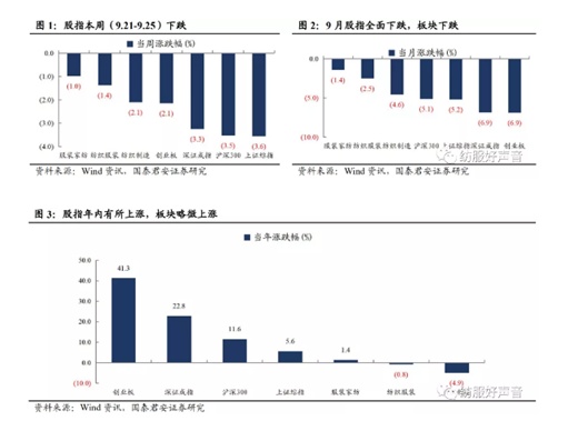 本周(9.20-9.25)创业板下跌2.14%,报2540.43点;深证成指下跌3.25%,报12814.17点;沪深300下跌3.53%,报4570.02;上证综指下跌3.56%,报3219.42点。