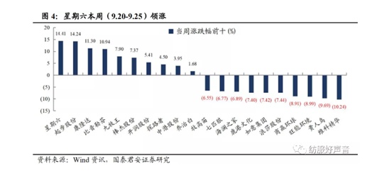 本周(9.20-9.25)申万板块全面下跌。房地产(-6.36%)、汽车(-6.47%)、有色金属(-7.20%)跌幅位列前三,而纺织服装行业跌幅为1.38% 。