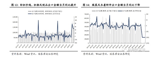 2020年8月,纺织纱线、织物及制品出口额当月同比增长46.96%(增速环比-1.42pct,同比+49.55pct);服装及衣着附件出口额当月同比增长3.23%(增速环比+11.77pct,同比+9.61pct)。