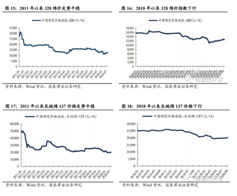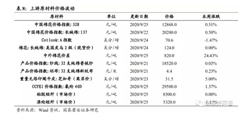 原材料方面,本周(9.20-9.25)国内外棉价差大幅上涨。中国棉花价格指数:328为12868元/吨,较上周上涨65元/吨,近一月上涨217元/吨,较年初下跌2831元/吨;中国棉花价格指数:长绒棉:137为20200元/吨,较上周上涨100元/吨,近一月上涨300元/吨,较年初下跌5000元/吨;Cotlook:A指数为70.6美分/磅,较上周下跌1.05美分/磅,近一月下跌1.00美分/磅,较年初下跌19.00美分/磅;中外棉花价差为820元/吨,较上周上涨161元/吨,近一月上涨487元/吨,较年初下跌5元/吨。