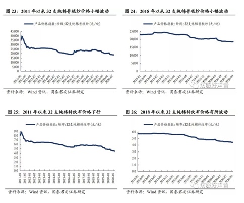 棉纱价格本周(9.20-9.25)小幅下跌。截至2020年9月25日,中国纱线价格指数(CY Index):OEC10S报11765元/吨,较上周下跌10元/吨,近一月上涨15元/吨,较年初下跌1335元/吨;中国纱线价格指数(CY Index):C32S报18520元/吨,较上周报价未变0元/吨,近一月上涨30元/吨,较年初下跌2115元/吨;中国纱线价格指数(CY Index):JC40S报21820元/吨,较上周下跌10元/吨,近一月上涨30元/吨,较年初下跌2165元/吨。