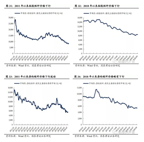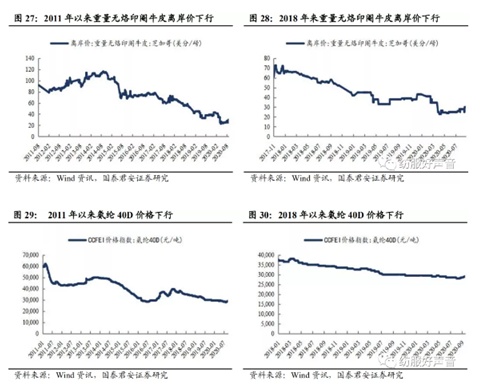 粘胶类价格较为稳定,涤纶类价格以下跌为主。粘胶长丝报36000元/吨,较上周报价未变0元/吨,近一月下跌1800元/吨,较年初下跌1500元/吨;粘胶短纤1.5D报8500元/吨,较上周报价未变0元/吨,近一月下跌6100元/吨,较年初下跌1000元/吨;涤纶短纤报5383.33元/吨,较上周下跌53元/吨,近一月下跌3742元/吨,较年初下跌1600元/吨;涤纶POY报5040元/吨,较上周上涨90元/吨,近一月下跌3610元/吨,较年初下跌2060元/吨;涤纶DTY报6450元/吨,较上周报价未变0元/吨,近一月下跌3775元/吨,较年初下跌2400元/吨。