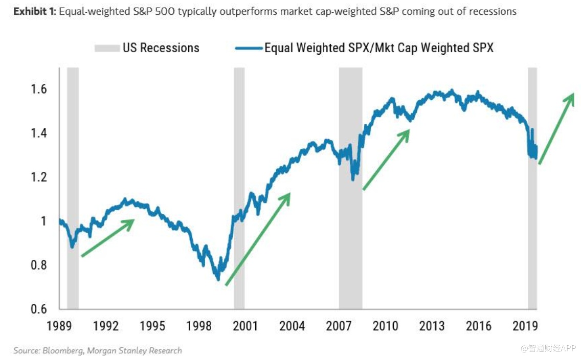 Wilson指出,这些短期障碍将在年底前清除,这意味着复苏将在2021年继续。在实际利率已经触底的情况下,投资者应该关注的领域包括消费周期/服务、材料、工业和金融等。在走出衰退时,等权重标准普尔500指数的表现优通常于市值加权标准普尔指数。Wilson表示,没有理由认为这次情况会不一样。