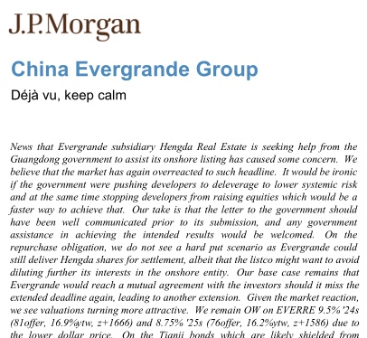 摩根大通表示,市场对谣言的反应过激,预计恒大将与战略投资者达成共识。考虑到市场反应,目前恒大债券估值极具吸引力。