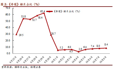 3、票房预测:票房增量可期,马太效应或更为明显。考虑到国庆档期影片类型涵盖剧情、喜剧、动作以及动画等多个类别,或许有利于满足多元观影需求;此外,今年各地对于国庆省际出行和旅游有一些软约束,可能会促使观影需求上升并助推票房的上升。因此,我们认为今年国庆档期票房总体仍将较复工以来的票房有明显的增长,预计可以达到40亿左右,但同比增速与去年相比或将有所回落。同时,我们认为尾部影片的票房表现或将差强人意,强者恒强弱者愈弱的马太效应或更为明显。建议关注:光线传媒、万达电影、横店影视、金逸影视、幸福蓝海和猫眼娱乐等标的。