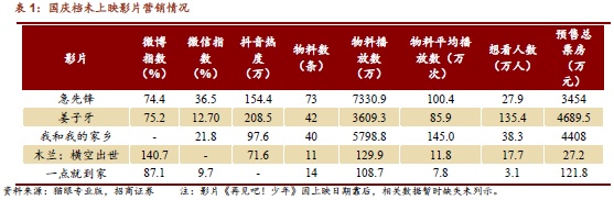 结合国庆档影片涉及的上市公司,我们建议关注:关注度颇高的动画电影《姜子牙》的主要出品方光线传媒,凭借票房增长获得增量收入的主要院线公司:万达电影、横店影视、金逸影视,幸福蓝海、猫眼娱乐(01896)。