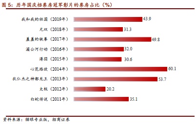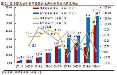 纵向来看,2011年国庆档和春节档票房分别为2.9和3.4亿元,2019年分别录得47.9和59.0亿元,CAGR分别为41.98%和43.08%,总体增速喜人。由此可见,国庆档和春节档已然成为电影行业重要的发展节点,制作和出品公司的业绩兑现离不开春节档和国庆档的表现。