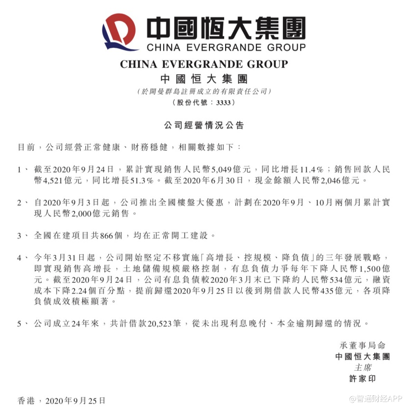 最近几天来,中国恒大遭到境外势力恶意做空一事引起广泛关注。受恶意做空影响,9月25日恒大股价异动。为进一步回击市场谣言,9月25日晚间,中国恒大发布公告,通过晒出多项核心指标,全面展现了公司稳健的经营及财务状况。9月28日,恒大三只股票全线上涨重挫空头。其中,中国恒大(03333)大涨21%至16.62港元。