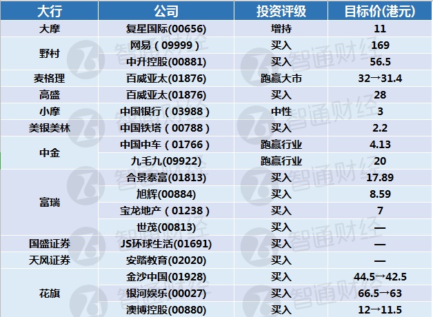 9月28日,各大行对港股最新投资评级及目标价汇总如下: