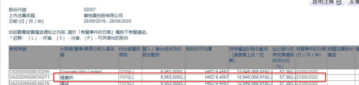 智通财经APP获悉,香港联交所最新资料显示,9月23日,碧桂园(02007)联席主席,执行董事杨惠妍增持公司695.3万股,每股作价9.4567港元,总金额约为6575.24万港元。增持后最新持股数目约为126.5亿股,最新持股比例为57.38%