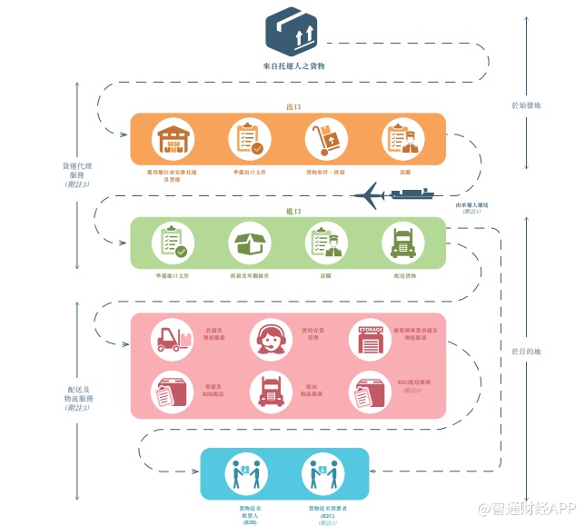 该公司的业务模式主要涉及主要通过自航空承运人及船运公司处获得货舱来提供货运代理服务(包括空运代理及附带海运代理),以使托运人的货物平稳地流向收货人(或消费者,视情况而定),并处理进出口所需的文件及为该公司的直接客户提供配送及物流服务,包括仓储及增值服务、配送服务及逆向物流服务。