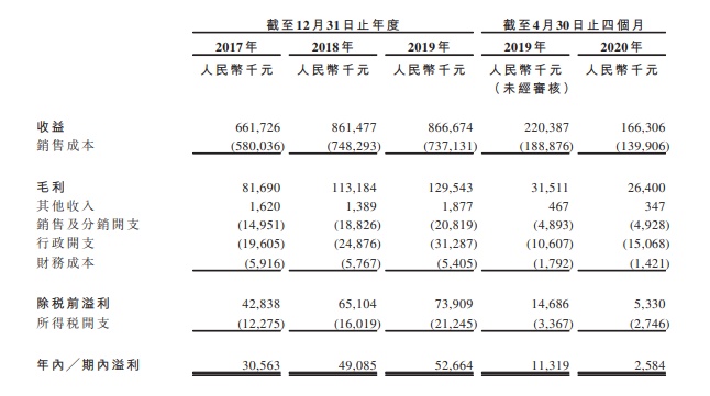 截止至2019和2020年前四个月,该公司收入分别为2.2亿和1.7亿元人民币。期内净利润分别为1132万和258万元人民币。