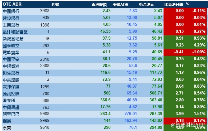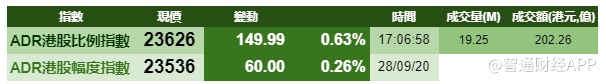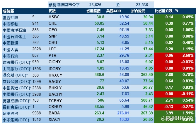 智通财经APP获悉,周一美股三大指数涨超1%,港股ADR指数跟随上涨,按比例计算,收报23626点,涨149.99点或0.63%。