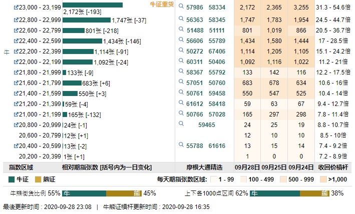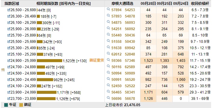 智通财经APP获悉,截至9月28日,恒指最新的牛熊街货比例55:45。摩根恒指牛熊证街货分布图中的数据显示,熊证街货重货区在24900-25099区间,该区间最新熊证数量为1523张,较上一交易日增加130张;最多新增在23700-23899区间,较上一交易日增加679张。牛证街货重货区在23000-23199区间,该区间最新牛证数量为2172张,较上一交易日减少193张,最多新增在21600-21799区间,该区间最新牛证数量为683张,较上一交易日增加6张。