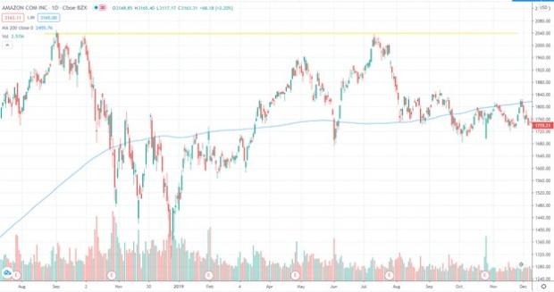 在Prime会员日之后,亚马逊的股价一直飙升到9月初,但就在2040美元附近遇到了强大阻力(即下图中黄线所代表的阻力位),并在2018年第四季度的市场抛售中小幅回弹然后下跌至年底。沃尔玛和塔吉特的股价则保持上升势头直到11月初跟着大盘暴跌。
