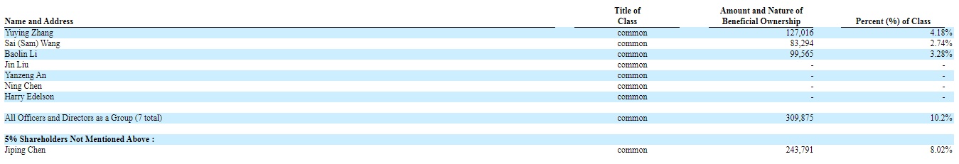 公司董事会主席兼首席执行官Yuying Zhang持有公司4.18%的股权,首席财务官Sai (Sam) Wang持有公司2.74%的股权。