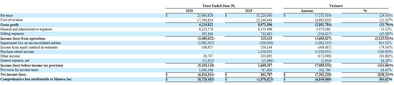 2020财年公司总营收为2368.4万美元,同比下降24%;毛利润为611.9万美元,同比下降31.8%;营业亏损为349万美元,上年同期营业利润为11.5万美元;净亏损651万美元,上年同期录得净利润88万美元;归属于普通股股东基本及摊薄后每股亏损2.25美元,上年同期录得每股盈利0.32美元。