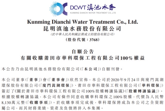 智通财经APP获悉,9月24日,滇池水务(03768)宣布,公司与厦门嵩湖环保股份有限公司、莆田市华科环保工程有限公司(以下简称华科环保)签订协议,收购华科环保100%股权,代价为人民币8130万元,交易各方已签订股权转让协议。