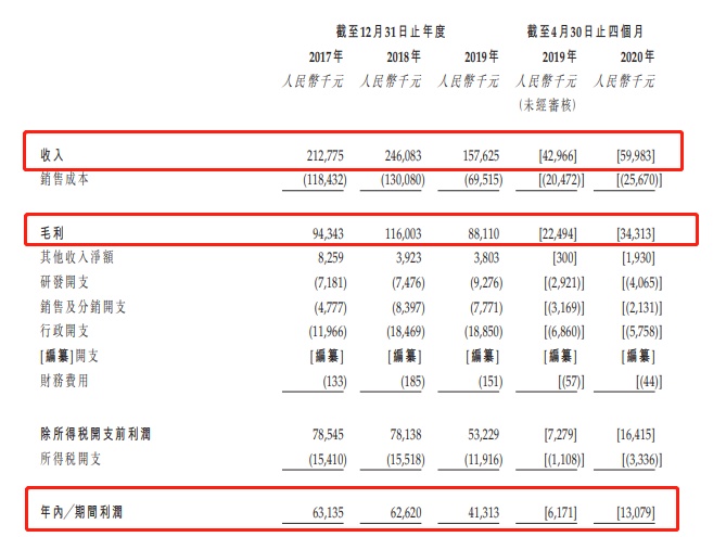 截至2017年、2018年 及2019年12月31日止年度各年,公司收入分别为2.13亿元、2.46亿元及1.58亿元;毛利分别为9434.3万元、1.16亿元及8811万元;年内利润为6313.5万元,6262万元及4131.3万元。