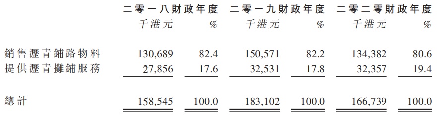 公司的主要营收来自销售沥青铺路物料。于2018—2020财政年度,销售沥青铺路物料产生的收益分别约为1.31亿港元、1.51亿港元及1.34亿港元,占于往绩期内总收益分别约82.4%、82.2%及80.6%。