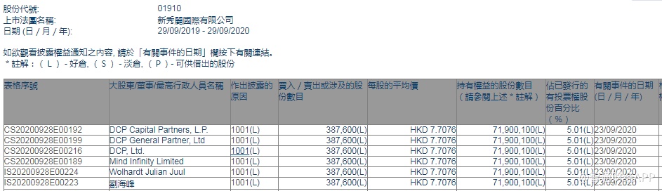 智通财经APP获悉,香港联交所最新资料显示,9月23日,DCP, Ltd.增持新秀丽(01910)38.76万股万股,每股作价7.7076港元,总金额约为298.75万港元。增持后最新持股数目约为7190.01万股,最新持股比例为5.01%。