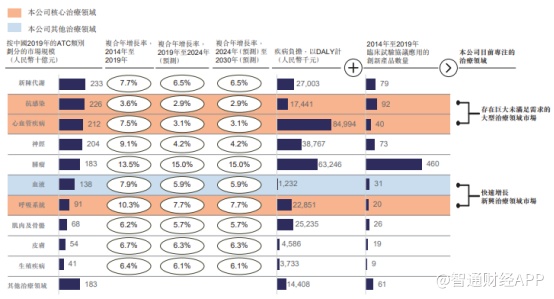 智通财经APP了解到,抗感染为中国第二大治疗领域,2019年市场规模达到2255亿元(人民币,单位下同),占整个中国医药市场的13.8%;心血管疾病为中国第三大治疗领域,2019年的市场规模为2120亿元;而呼吸系统为其中增长最快的新兴治疗领域,2019年的市场规模为908亿元,自2015年的复合年增长率为10.3%。