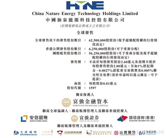 智通财经APP观察到,纳泉能源科技在今年4月份递表之后,于近期通过港交所主板聆讯,并于9月29日起开始招股。其独家保荐人是富强金融资本,预计全球发售6250万股股份,其中香港公开发售625万股股份,国际配售5625万股股份。