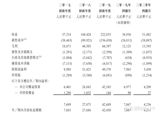2017年至2019年,公司录得收益5731万、1.44亿、2.23亿元人民币,年复合增速97%,2020年前四个月收入5148万元,同比增长39.4%。同期毛利润分别为1887万、4450万、6640万及1339万元,毛利率32.9%、30.8%、29.8%及26%。股东应占净利润640万、2684万、4255万及421万元,净利率13.4%、19.3%、19.2%及8.2%。
