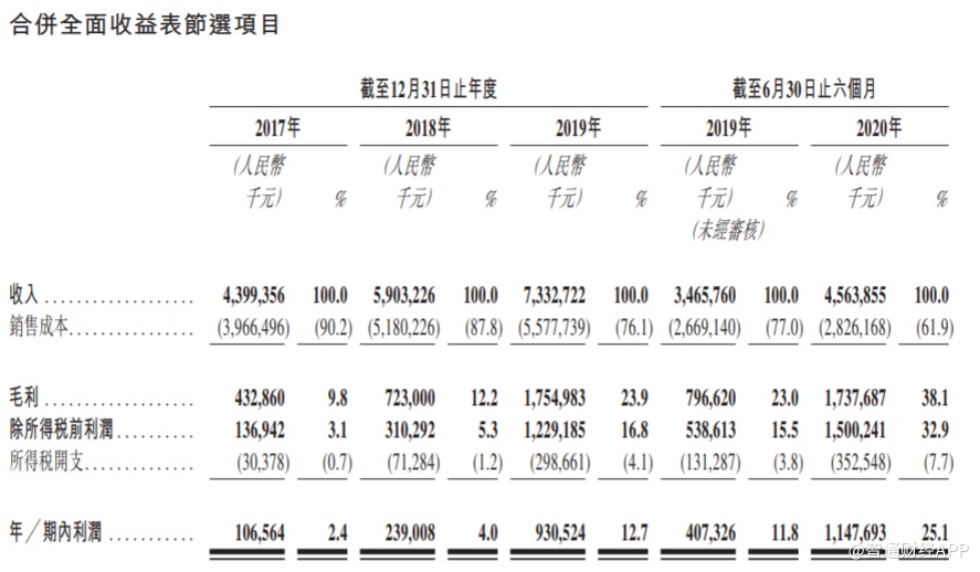 于2017年、2018年及2019年以及截至2020年6月30日止六个月,公司的收入分别为人民币(下同)43.994亿元、59.032亿元、73.327亿元及45.639亿元;公司净利润分别为1.066亿元、2.39亿元、9.305亿元及11.477亿元。